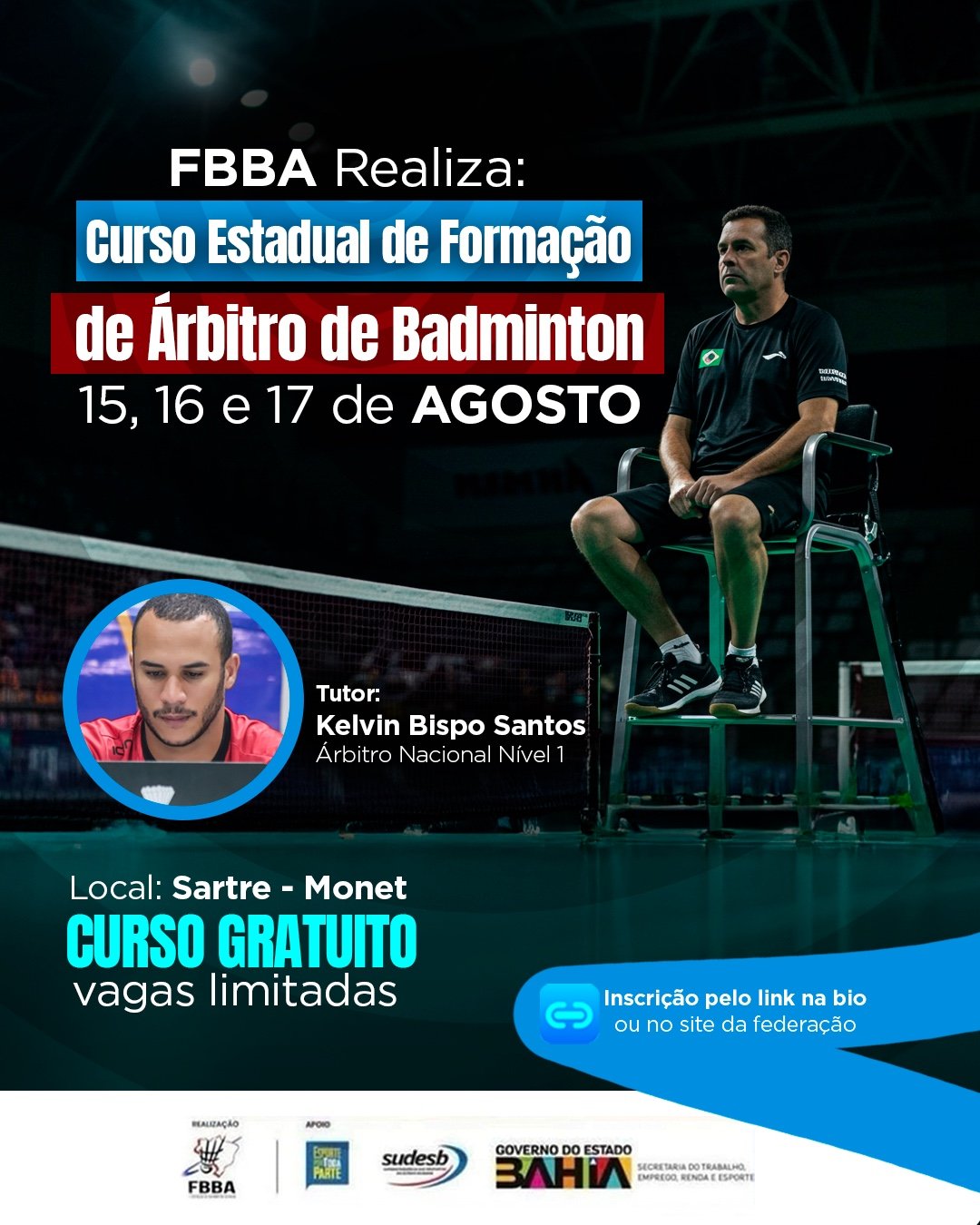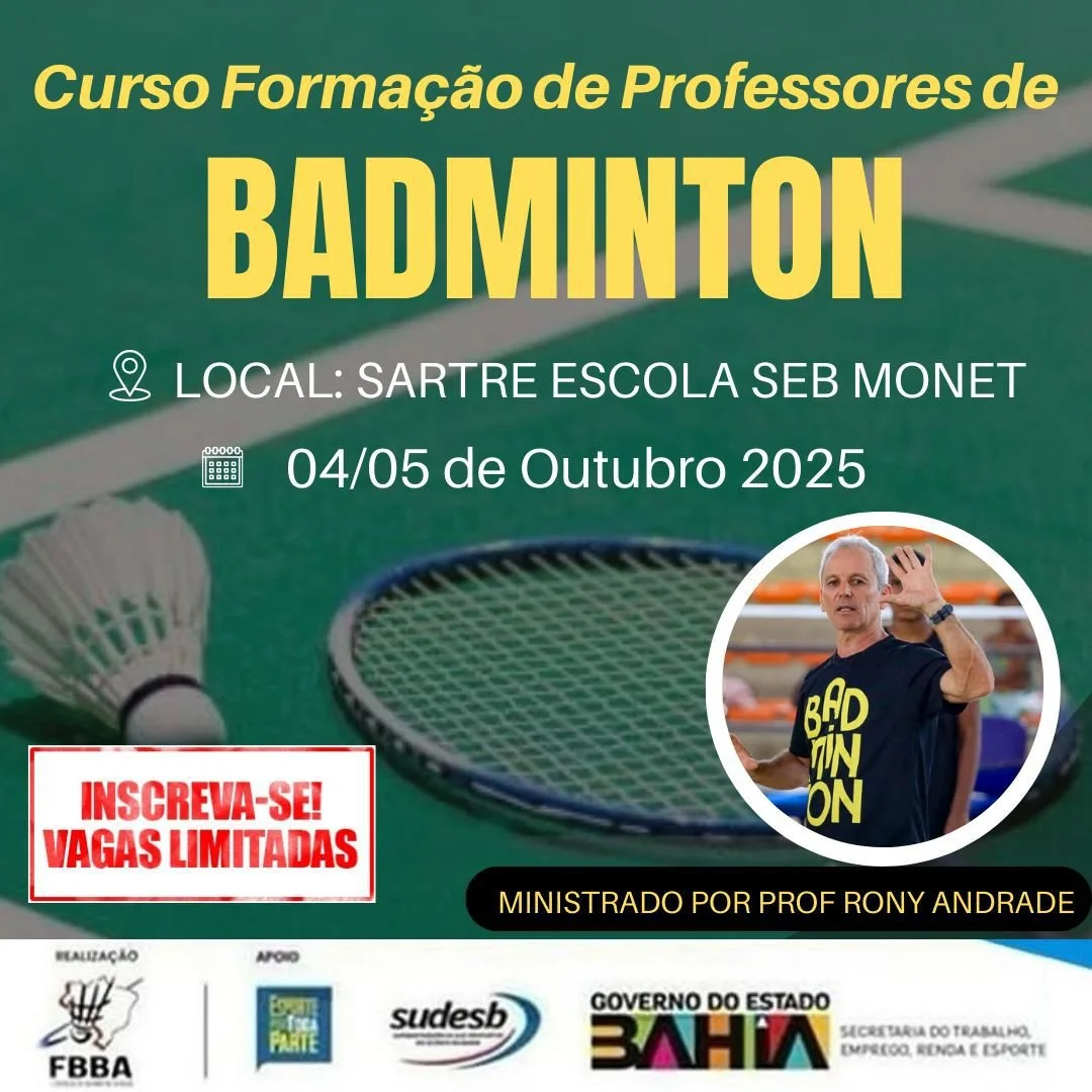Local: Sartre Escola SEB - Unidade Monet (Vilas do Atlântico, Lauro de Freitas)Quer se tornar um árbitro de badminton e atuar em competições oficiais? Nosso curso oferece formação completa sobre regras, técnicas de arbitragem e postura profissional em quadra. Uma oportunidade única para quem deseja contribuir com o crescimento do esporte!